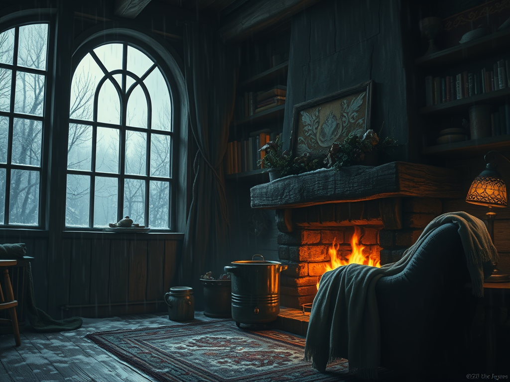 Outside, the rain is falling harder, drumming its own impatient rhythm. Inside, the fire glows, the house hums quietly, and the world narrows to the warmth of the room and the stories waiting just beyond the threshold.