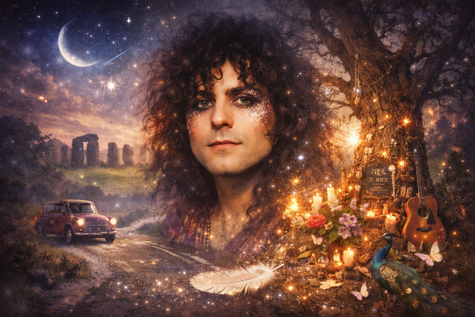 Yet there is gentler folklore too. The idea that Marc Bolan didn’t vanish so much as… disperse. That he reappears whenever glam resurfaces, whenever outsiders find confidence in sparkle, softness, and strangeness. Not reincarnation, exactly. More echo. A chord still humming after the string has been struck.